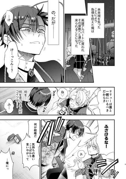 ライトノベルの世界にモブキャラクターとして転生したリリューは、原作知識という未来視の力を武器に、本来なら主人公アルバートが成し遂げるはずだった数々の功績を横取りしてきた。しかし、物語が終わりを迎えると同時に、彼の栄光も崩れ去る。手柄を失ったリリューを待っていたのは過酷な現実だった。巨額の借金に押し潰され、婚約者からも見放され、生活は完全に破綻してしまう。絶望の淵に立たされた彼の前に姿を現したのは、皮肉にも手柄を奪われ続けた張本人であるアルバートその人だった。借金の担保として「買われた」リリューは、アルバートの住む公爵邸へと強制的に連れて行かれる。そこで待っていたのは、男性同士でありながら一方的に押し付けられる「結婚」という名の束縛だった。指にはめられた指輪は決して外れることがなく、彼から逃げ道を完全に奪い去る。こうして始まったのは、日常的にアルバートに身体を弄ばれる屈辱的な生活だった。リリューがどれほど嫌がり抵抗しても、彼はまるで壊れやすいおもちゃを扱うかのような冷酷さで彼を支配し続ける。本作は「成り代わりモブは逃げられない」の正統な続編として位置づけられている。各話は独立した完結形式ではなく、「続く」形式で展開されるため、今後の自作に期待です。
